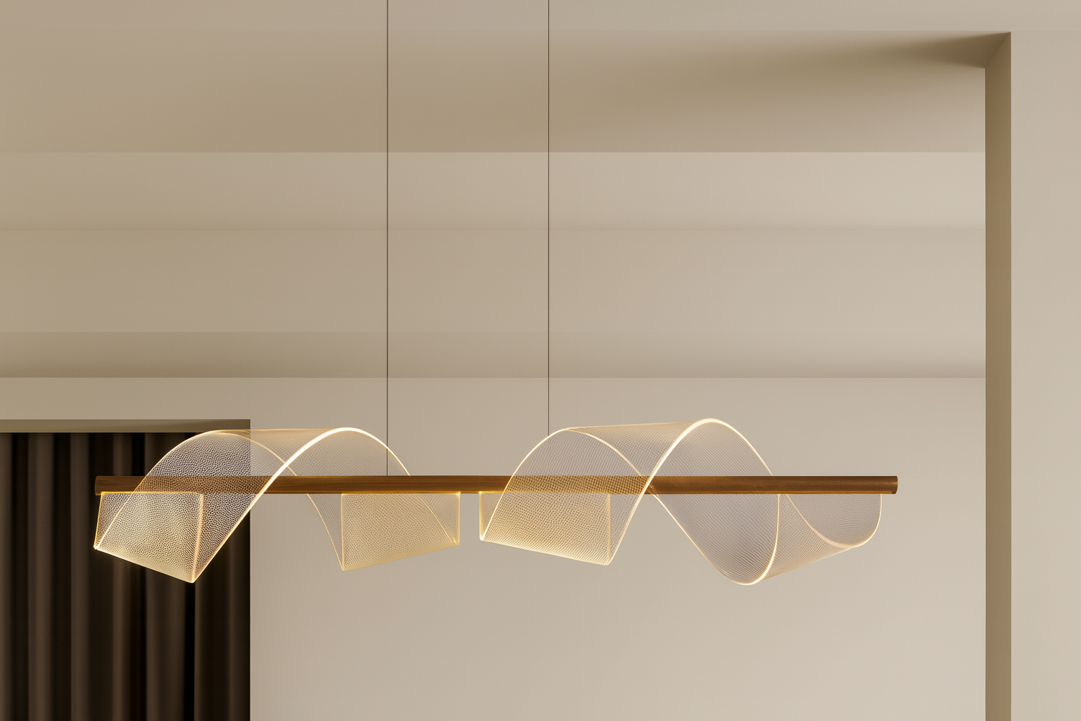 Ondara interpreta la fluidità delle forme naturali con un profilo in metallo dorato che sostiene un diffusore in acrilico trasparente, scolpito in morbide onde luminose.