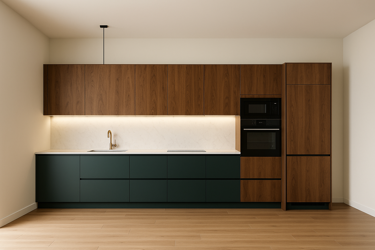 Adren è una cucina che combina eleganza e intensità cromatica in un design lineare e deciso. Le ante in noce naturale scaldano l’ambiente, mentre le basi in verde petrolio opaco donano profondità e carattere. Il top e il paraschizzi in finitura marmo chiaro creano un contrasto delicato, esaltato dalla luce LED integrata sotto i pensili che aggiunge un tocco contemporaneo e funzionale.