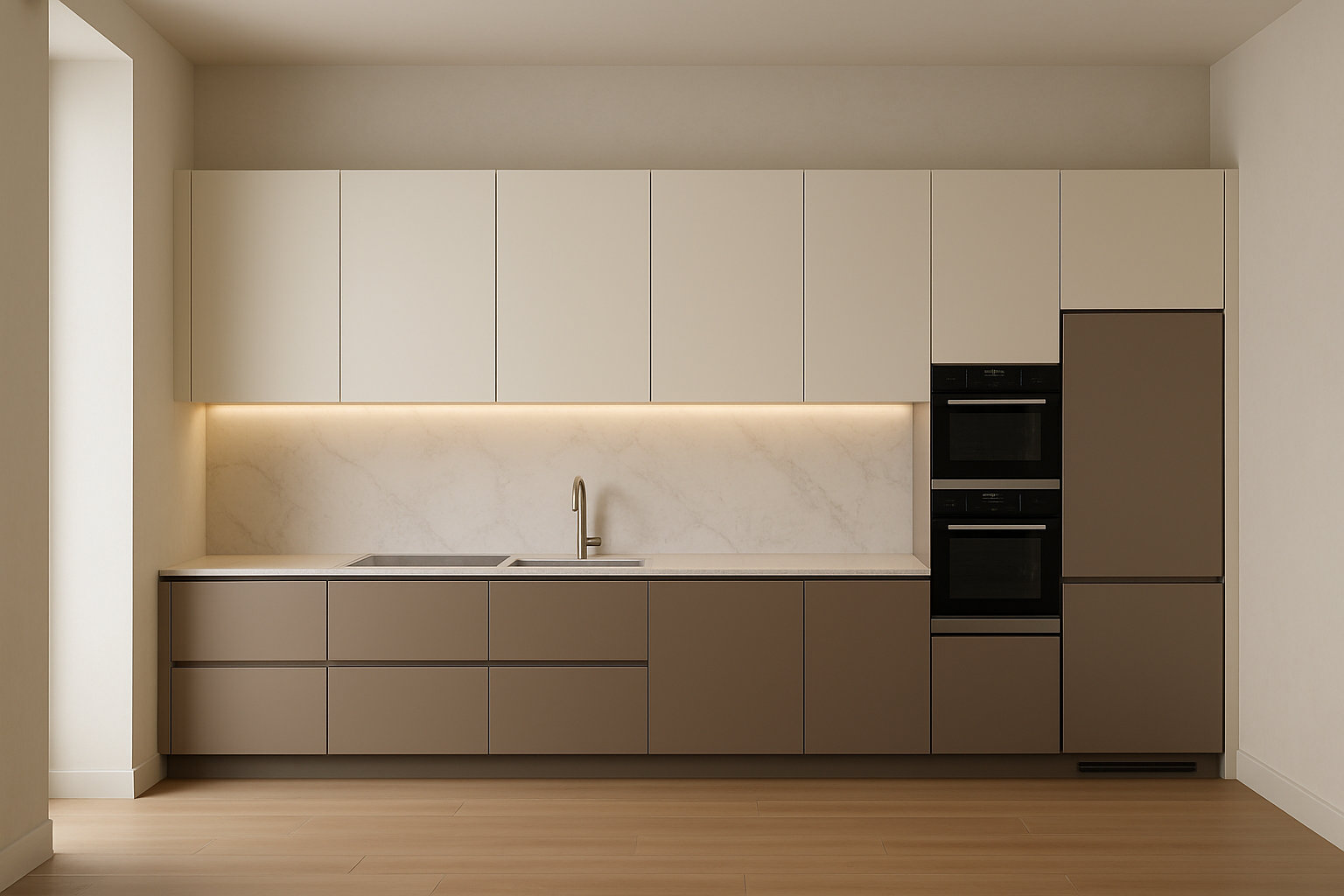 Cales è una cucina dal carattere sobrio e luminoso, dove la semplicità delle forme incontra la morbidezza dei toni neutri. Le basi in tortora si fondono perfettamente con i pensili color crema, creando una continuità visiva elegante e rilassante. Il top e il paraschizzi in finitura marmo chiaro esaltano la linearità della composizione, riflettendo la luce naturale e amplificando la percezione dello spazio.