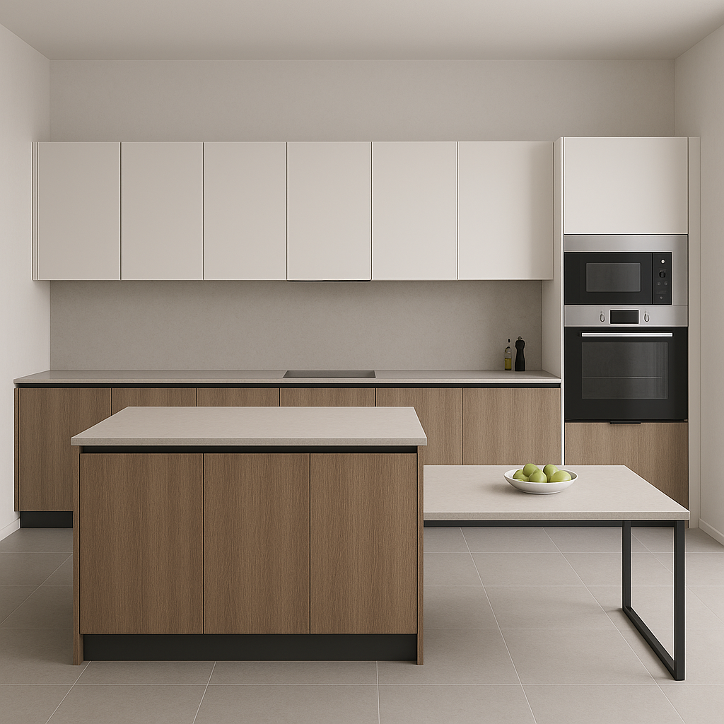 Le colonne laterali integrano forno e microonde in un blocco funzionale, mantenendo la linearità del progetto. Ogni elemento è pensato per un’estetica minimal ma accogliente, ideale per chi ama gli ambienti chiari e ordinati.