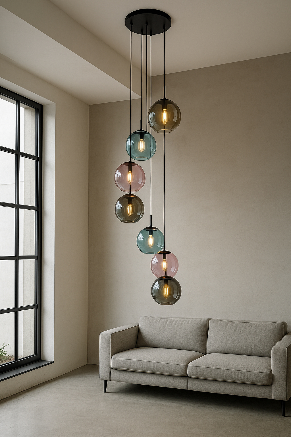 Otto sfere in vetro soffiato, declinate in tonalità raffinate come champagne, fumé, rosa cipria, azzurro acqua e grigio titanio, scendono a diverse altezze creando un movimento fluido e armonico.