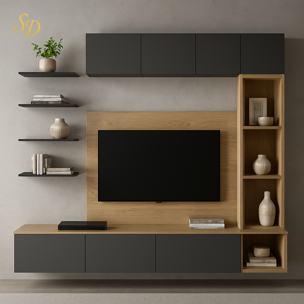 La parete Frame Line nasce dall’incontro tra calore materico e geometria pura. Il pannello in rovere naturale incornicia la zona TV come un quadro contemporaneo, mentre i moduli sospesi in grigio grafite opaco definiscono volumi lineari e bilanciati. Le mensole sottili e la colonna laterale a giorno ampliano la composizione, offrendo spazi per libri e oggetti decorativi. Una soluzione elegante e funzionale, ideale per living dal carattere sobrio e raffinato.