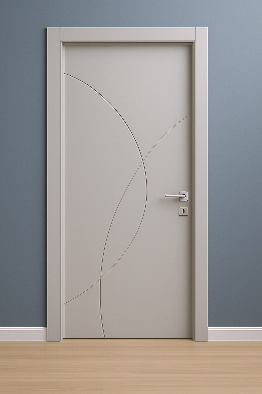La porta Linea Evos si distingue per il suo equilibrio formale: due linee morbide si intersecano con eleganza, creando un motivo fluido e leggero che valorizza la superficie liscia dell’anta. Un design che coniuga sobrietà e ricercatezza, ideale per interni moderni e raffinati.