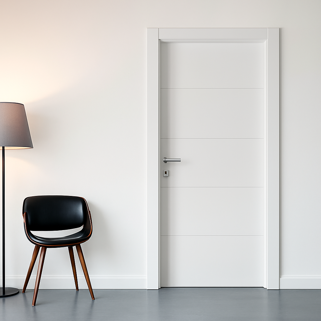 La porta Linea Pure rappresenta l’essenza della semplicità. Le incisioni orizzontali sottili definiscono un ritmo equilibrato, capace di valorizzare spazi moderni e luminosi senza interrompere la continuità visiva. La finitura bianco opaco amplifica la luce e si adatta a ogni ambiente, dall’abitazione privata allo studio professionale.