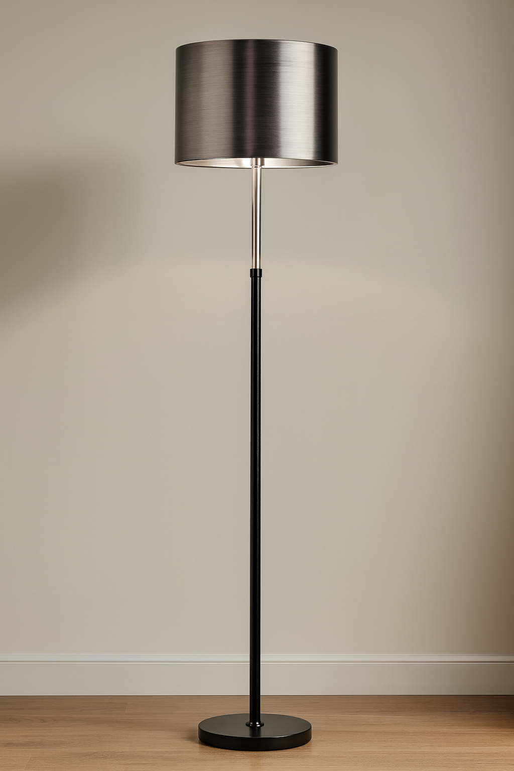 Il suo corpo sottile in metallo nero sostiene un paralume cilindrico in argento satinato spazzolato, capace di diffondere una luce morbida ma diretta. Le proporzioni eleganti e il profilo snello la rendono una scelta ideale per interni raffinati, sia domestici che professionali.