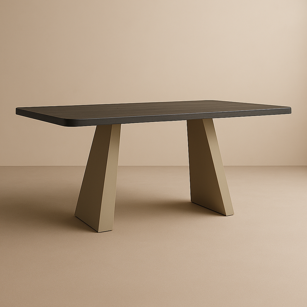 Il tavolo Nara unisce proporzioni solide e design scultoreo in un equilibrio visivo di grande eleganza. Le gambe inclinate in legno verniciato, dalla forma trapezoidale, sostengono un piano in essenza scura dalle linee morbide e bordi smussati. Il contrasto tra le tonalità calde della base e la profondità del piano crea una presenza contemporanea e raffinata. Perfetto per ambienti moderni che privilegiano materiali autentici e geometrie essenziali.