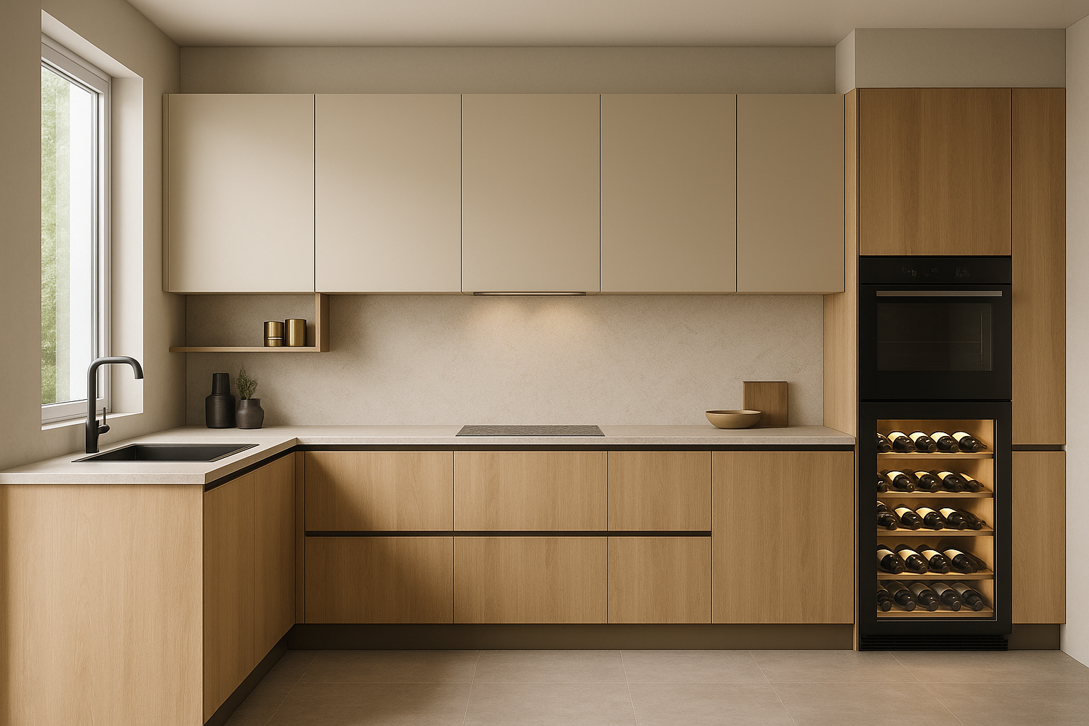 Oressa è una cucina che unisce leggerezza visiva e calore materico. Il rovere naturale incontra il beige sabbia in una composizione dal carattere sobrio ma accogliente, dove ogni dettaglio è studiato per favorire equilibrio e continuità. Il design lineare, privo di maniglie, si integra perfettamente con il top chiaro e le superfici vellutate dei pensili. Il modulo con cantinetta a vista aggiunge un tocco distintivo, fondendo estetica e funzionalità in un’unica armonia.