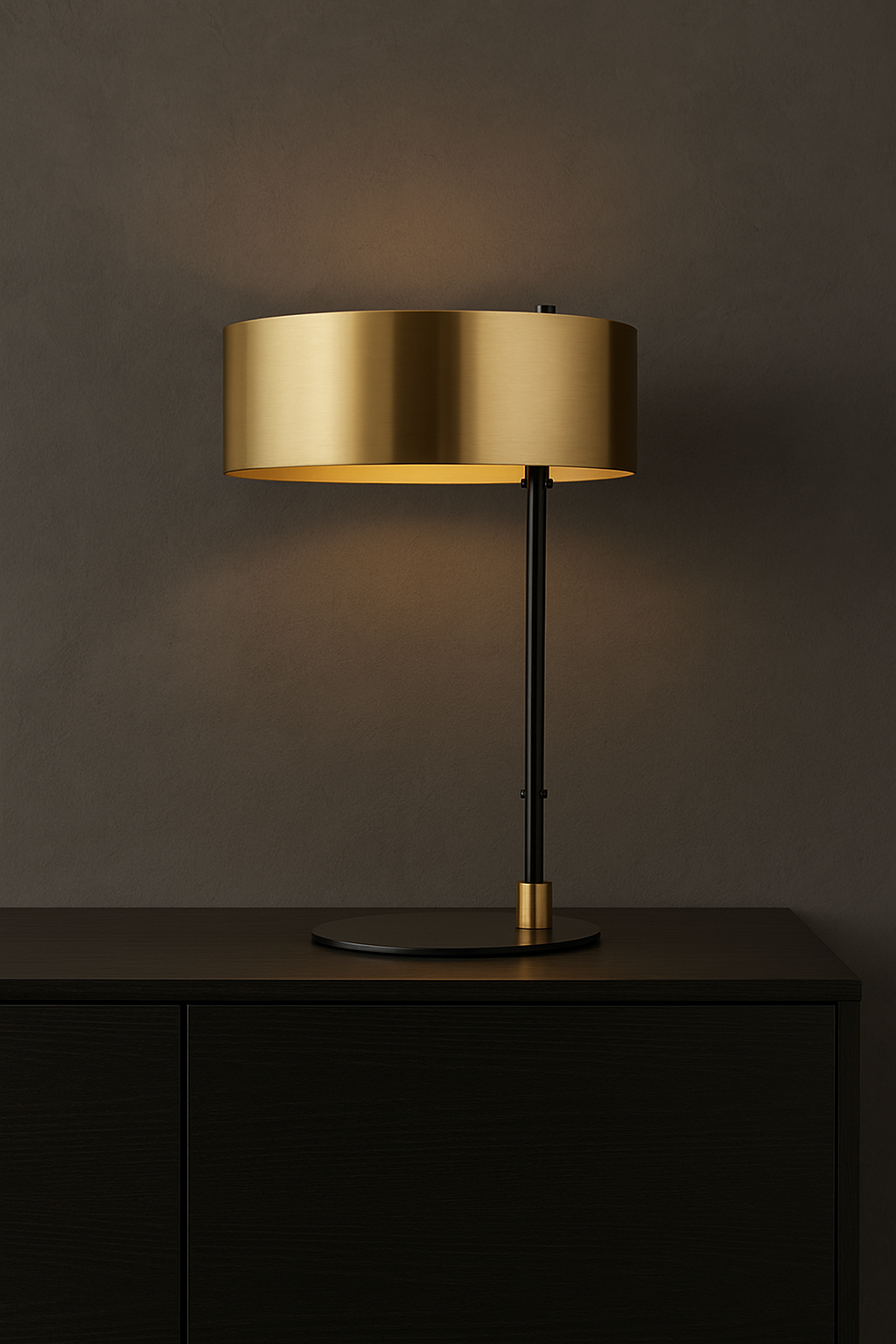 Il paralume cilindrico in metallo dorato riflette una luce calda e morbida, mentre la struttura in metallo nero opaco ne sottolinea la sobrietà formale.