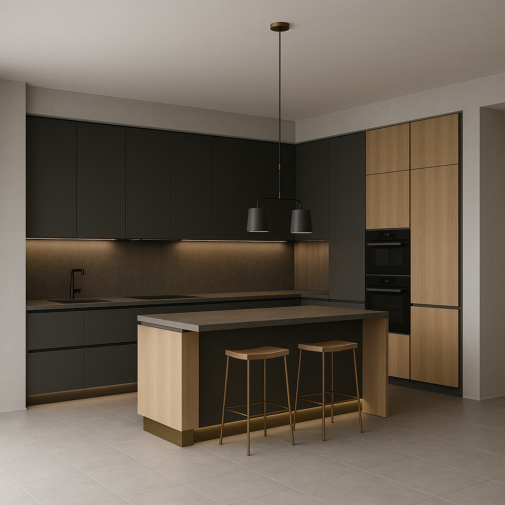 La cucina Varen esprime un’eleganza sobria e decisa, giocata sull’equilibrio tra superfici scure e calde venature lignee. Le linee sono pure, essenziali, studiate per ottenere un impatto visivo raffinato e privo di eccessi. L’isola centrale diventa fulcro funzionale e conviviale, con dettagli metallici che richiamano la finitura dorata dei profili inferiori e delle sedute. L’illuminazione integrata sotto i pensili crea un’atmosfera calda e accogliente, valorizzando la matericità delle superfici.