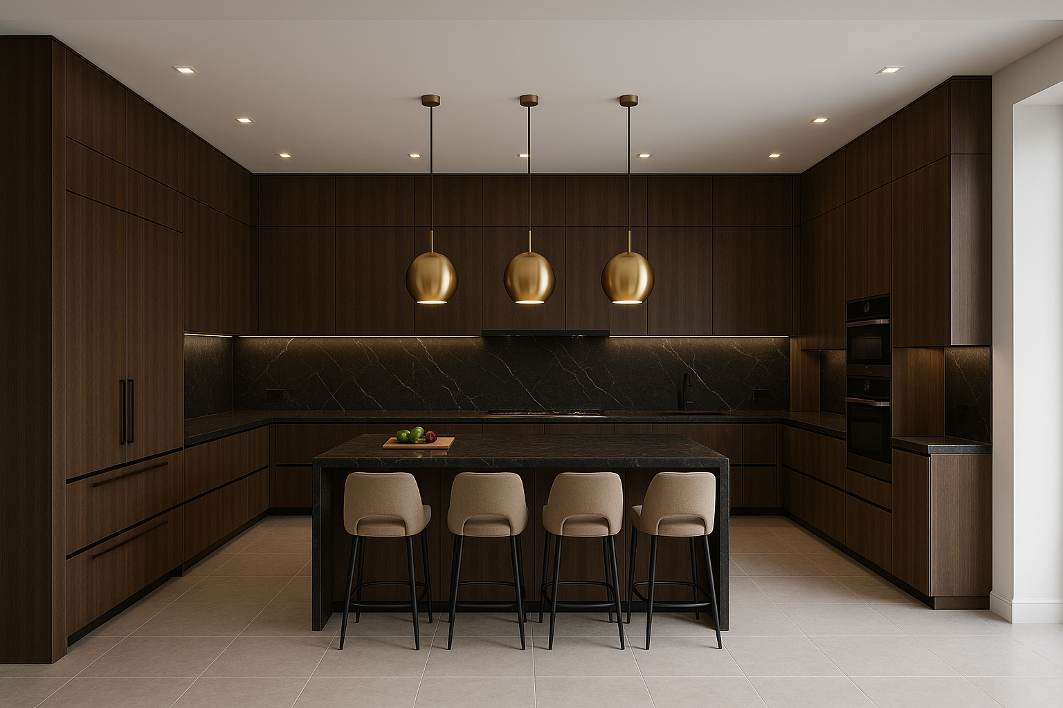 Velar interpreta la cucina come spazio di equilibrio tra calore e prestigio. Le superfici in noce scuro si fondono con il top e il paraschizzi in HPL effetto marmo nero, creando una composizione avvolgente e sofisticata. Le venature calde del legno incontrano l’eleganza della pietra scura, mentre la luce LED sottopensile e i tre corpi illuminanti dorati sospesi aggiungono un tocco scenografico e raffinato.