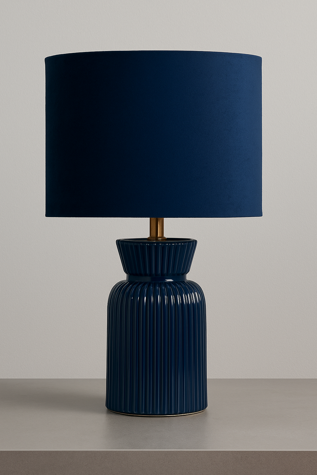 Velour Bleu – Ceramica blu profondo con paralume vellutato blu notte, per spazi moderni e rilassanti