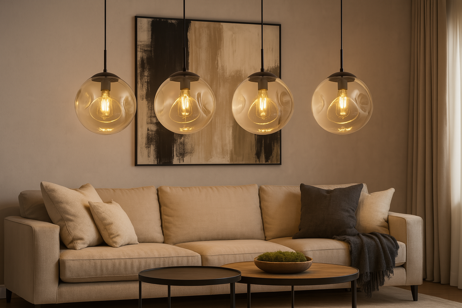 La sfera in vetro soffiato color champagne, con leggere ondulazioni superficiali, diffonde una luminosità morbida e avvolgente che valorizza ogni ambiente con naturale eleganza.