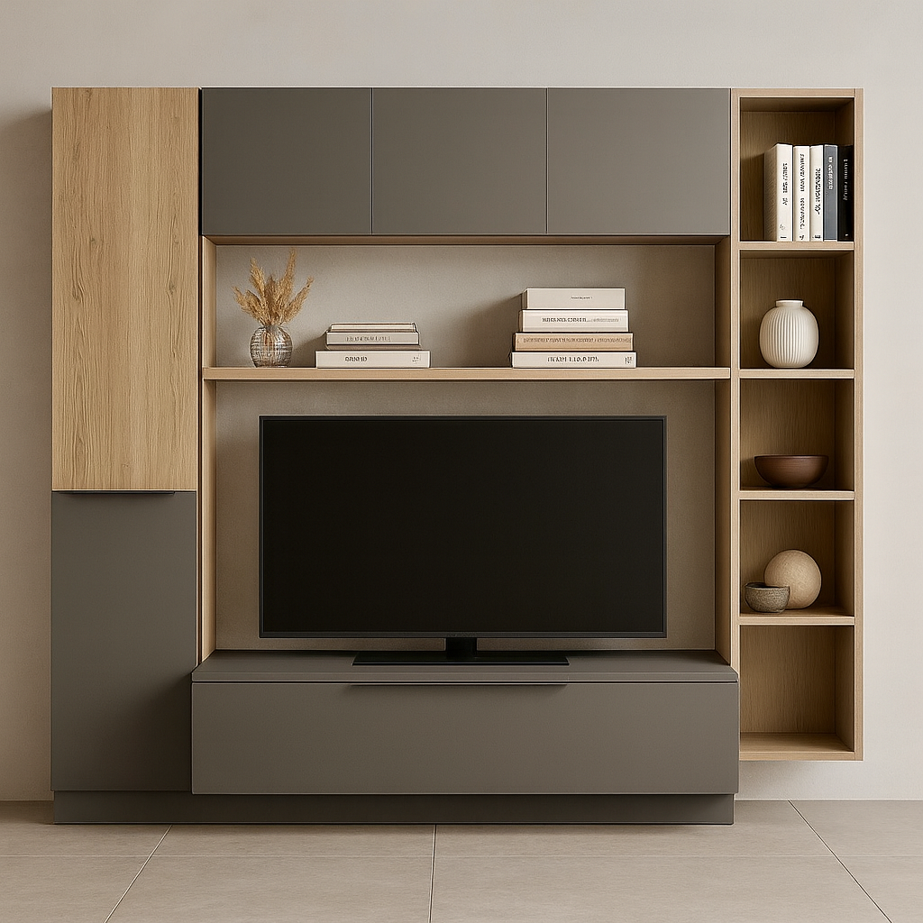 La parete Zeris interpreta il living contemporaneo con un equilibrio naturale tra ordine e calore. Le superfici laccate opache color tortora si alternano al rovere chiaro, creando un contrasto morbido e raffinato. La composizione integra vani chiusi e spazi a giorno, offrendo funzionalità e armonia visiva. L’ampio vano centrale accoglie la TV, mentre le mensole e la colonna laterale permettono di esporre libri e oggetti decorativi, rendendo ogni dettaglio parte del design.